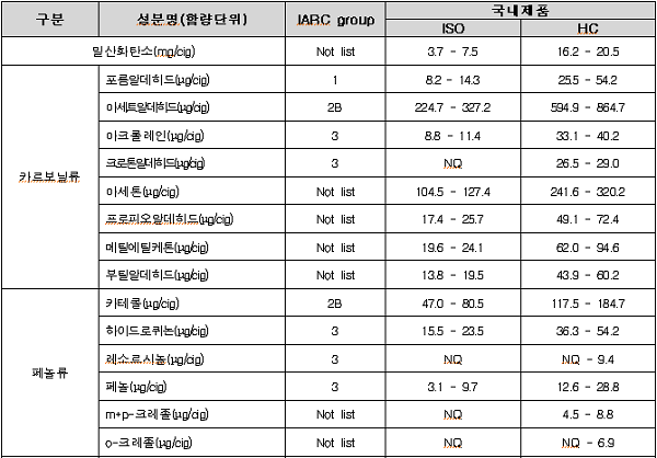 식품의약품안전처(이하 식약처)가 11일 발표한 궐련담배 및 전자담배의 유해성분 함유량 자료에 따르면 담배 연기에서 국제암연구소(IARC)가 분류한 1급 발암물질 7종과 2B급 발암물질 5종 등 모두 12종의 발암물질이 검출됐다.