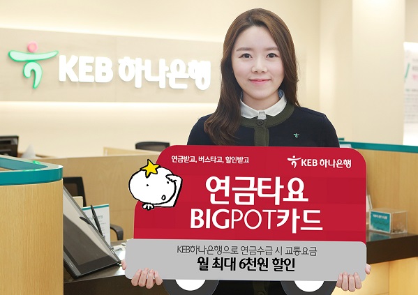 ‘연금타요 빅팟카드’는 공적연금(국민연금, 공무원연금, 사학연금, 군인연금)을 KEB하나은행 통장으로 수급 받는 손님을 대상으로, 전월 실적 20만원만 충족하면 발급 후 매월 최대 6천원까지 2년간 교통요금을 할인해준다.