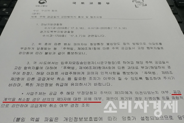 이에 문 씨는 “시스템이 ‘분양관리’를 제대로 해서 위장전입자를 걸러냈다면 이런 피해도 없었을 것”이라며 “전국의 아파트분양에서 이와 유사한 일이 비일비재하게 일어나지 않겠느냐”며 성토했다.