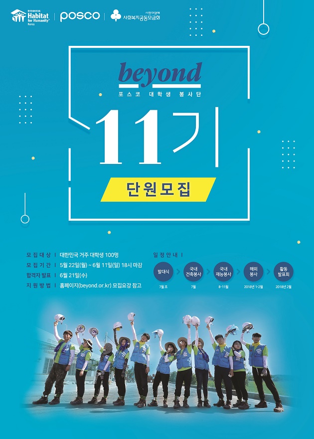 이번 선발되는 11기 비욘드 단원들은 오는 7월 발대식을 시작으로 약 8개월 동안 스틸하우스 건축, 역할팀별 재능봉사, 해외 건축 및 교육 봉사 등에 참여할 예정이다.