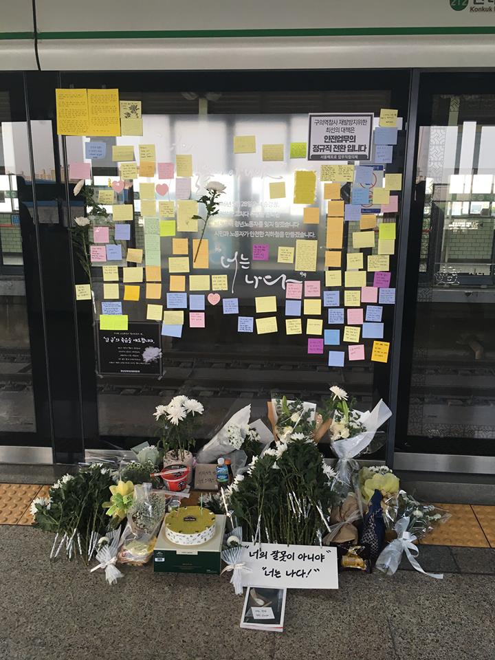 우원식 더불어민주당 원내대표는 현장을 찾아 헌화하고는 스크린도어에 “비정규직 없는 안전사회로 가겠습니다”라는 내용의 메모지를 붙였다.