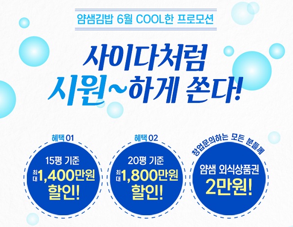 [소비자경제=김현식 기자] 얌샘김밥은 오는 6월 새로이 가맹점 개설 계약을 체결하는 창업주에게 본사가 창업비용의 일부를 지원하는 ‘쿨(COOL)한 창업자금지원 프로모션’을 실시한다고 30일 밝혔다.