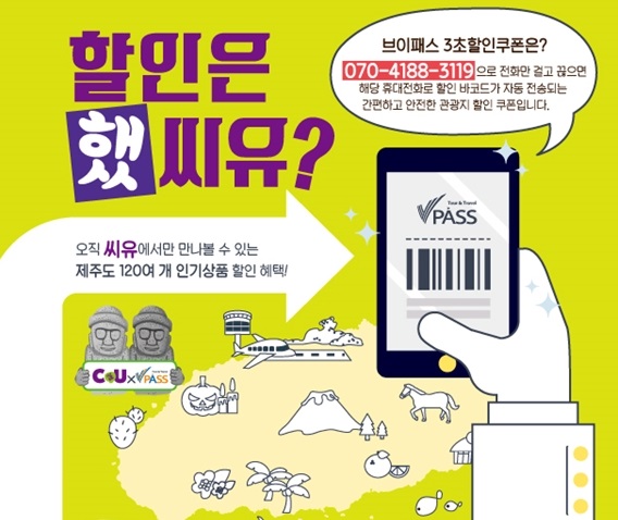 ‘브이패스’는 제주도 쿠폰 발급 1위 업체인 해우리가 운영하는 모바일 할인 쿠폰 서비스로, CU와 이번 협업을 통해 제주도 130여 곳 관광지의 입장권, 이용권을 최대 60%까지 할인된 가격에 제공한다.