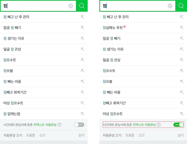 컨텍스트 자동완성은 네이버 모바일 및 PC에서 만나볼 수 있으며, 자동완성 키워드 화면 하단의 ON/OFF를 통해 설정할 수 있다.