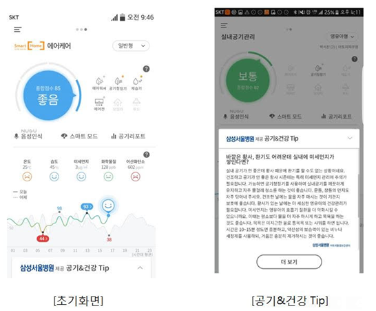 또한, 스마트 에어케어는 날씨 앱인 SK테크엑스의 웨더퐁을 통해 수집한 집 부근의 온도나 미세먼지 등 기상 상태를 실내 공기 정보와 함께 분석 후 서울삼성병원 전문의의 건강 관리 가이드를 제공한다.