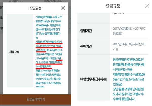 박씨는 “(소셜커머스에서 항공권을 구매할 때) 제품 안내 페이지에 취소 규정에 있는 기간에 따른 환불 규정만 살펴봤다”며 “여행업무취급수수료에 대해서는 좀 더 하단에 따로 나와 있었다”고 말했다.