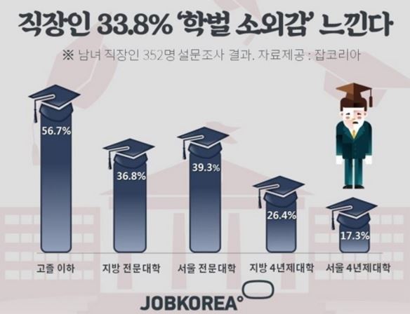 23일 취업포털 잡코리아에 따르면 직장인 33.8%가 '학벌 소외감'을 느낀다고 답했다.