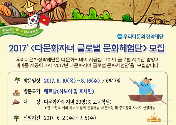 [소비자경제= 이수민 기자] 우리다문화장학재단은 26일 ‘2017년 다문화자녀 글로벌 문화체험’ 행사에 참가할 다문화자녀 중‧고등학생을 모집한다고 밝혔다.