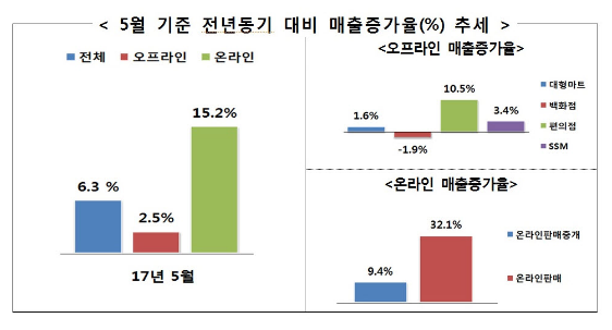 29일 산업통상자원부가 내놓은 ‘5월 주요 유통업체 매출 동향’에 따르면 지난달 유통업체 전체 매출은 10조2900억 원으로 전년 동기대비 6.3% 증가했다. 온라인(15.2%)과 오프라인(2.5%) 모두 늘었다.