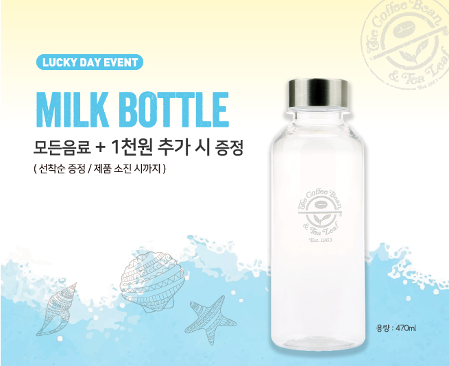 6월의 럭키데이 스페셜 상품은 이른 무더위에 미리 바캉스를 준비하는 이들을 위한 잇 아이템으로 ‘밀크보틀’을 준비했다. 모든 음료 구매 시 1000원을 추가하면 스페셜 상품을 받을 수 있으며, 매장 별 한정수량, 선착순으로 진행된다.