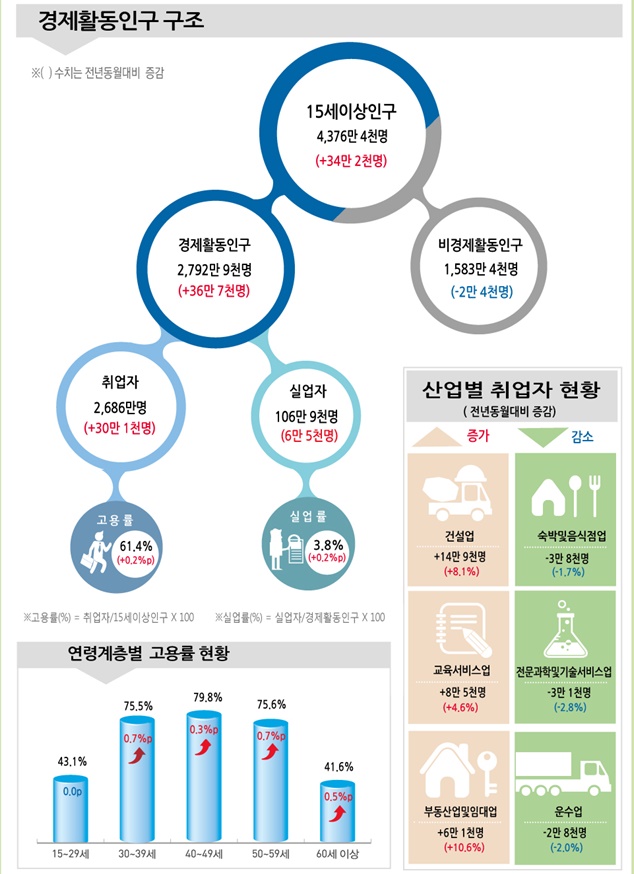 취업자는 2686만명으로 전년 같은 기간 대비 30만 1천명, 고용률은 61.4%로 0.2%p 상승했다. 반면 청년층(15∼29세) 취업자는 오히려 3만 4천명이 줄어들었다.