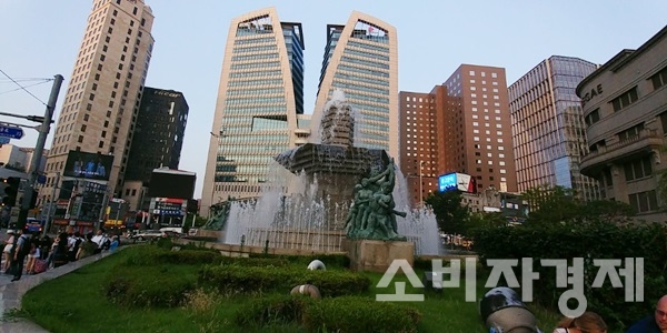 물줄기가 힘차게 뿜어져 나오는 서울 충무로에 위치한 포스트타워 앞 분수대가 폭염 속 무더위에 찌든 시민들의 발걸음을 조금이나마 식혀주고 있다.
