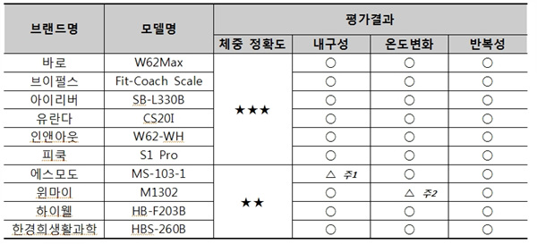 분석 결과, 체중의 정확도는 제품마다 달랐으며, 체지방률의 정확도는 우수한 제품은 없고 양호한 수준인 것으로 나타났다. 일부 제품의 경우 내구성 등에서 한국산업표준의 허용 범위에 미달하기조차 했다.