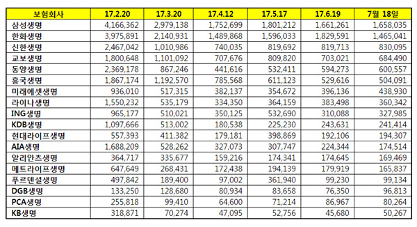 국내 보험사 브랜드평판 2017년 7월 순위는 삼성생명, 한화생명, 신한생명, 교보생명, 동양생명, 흥국생명, 미래에셋생명, 라이나생명, ING생명, KDB생명, 현대라이프생명, AIA생명, 알리안츠생명, 메트라이프생명, 푸르덴셜생명, DGB생명, PCA생명, KB생명 순이다.