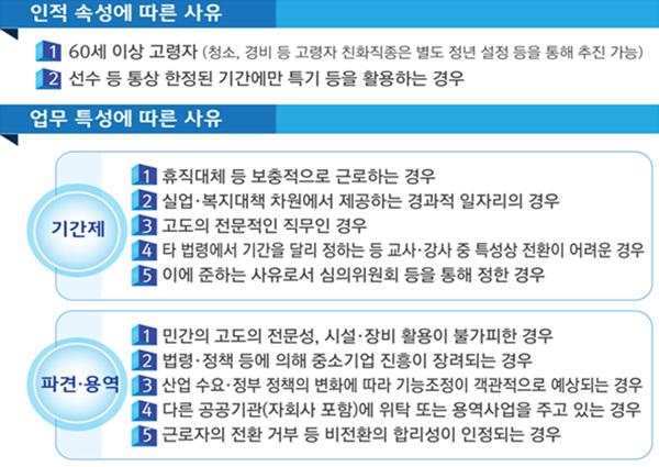 단 60세 이상 고령자나 선수 등 한정된 기간에만 특기 등을 활용하는 경우 등은 전환 대상에서 빠진다. 하지만 청소, 경비 같은 고령자들이 많이 일하는 직종은 별도 정년 설정 등을 통해 추진 가능하도록 했다.