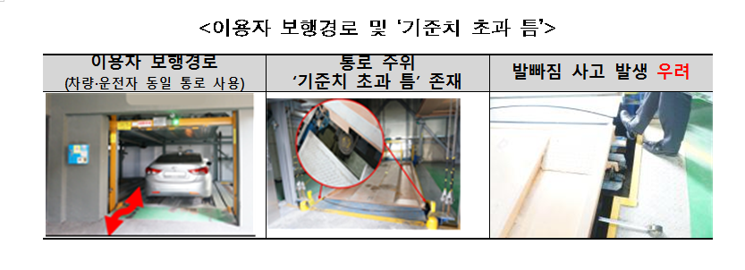 또 기계식 주차장 출입문은 별도의 강도기준 부재로, 주차대기 운전자의 부주의 또는 차량 오작동시 차량이 추락할 위험이 있어 대책마련이 필요하다. 조사결과, 기계식 주차장 60기 중 2기는 입고 대기 시 운반기가 최하층에 위치하고 있어 출입문이 잘못 열린 상태에서 차량이 진입하면 추락사고로 연결될 수 있었다.