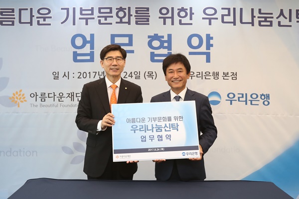 이날 협약은 기부문화 확산을 위해 양 기관의 상호협력을 목적으로 하며, 협약에 따라 우리은행과 아름다운재단은 ‘우리나눔신탁’을 통해 기부 희망자를 상호 소개하기로 했다.