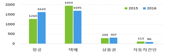 소비자원과 공정위에 따르면 항공, 택배, 상품권, 자동차 견인 서비스 분야에서 소비자 피해건수가 꾸준히 증가하고 있는 것으로 나타났는데, 최근 3년간 1348건(15년), 1689건(16년), 1193건(17년 1월부터 8월까지, 단순 환산시 1년 1789건)이었다.