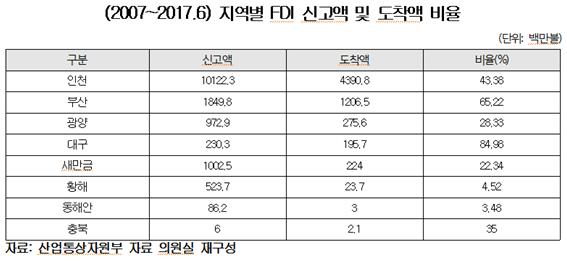 더불어민주당 어기구 의원(충남 당진시)이 28일 산업통상자원부로부터 제출받은 경제자유구역내 외자유치현황에 따르면 2007년부터 2017년 6월까지 지난 10년간 FDI 신고액은 148억불 실제 도착액은 63억불로 집계됐다.