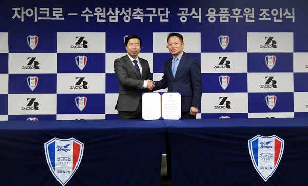 수원삼성과 자이크로는 8일 수원월드컵경기장 대연회장에서 김준식 대표이사와 최창영 자이크로 대표이사가 참석한 가운데 용품 후원 협약식을 가졌다.
