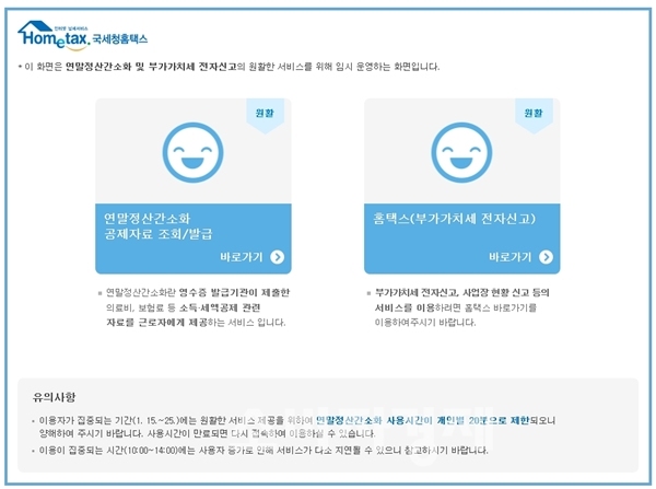 국세청은 공식 블로그를 통해 "이용이 집중될 것으로 예상되는 날인 오는 18일과 22일 그리고 부가세 신고마감일인 오는 25일에는 접속시간이 길어질 수 있으니 이용 자제를 부탁드린다"고 밝혔다.