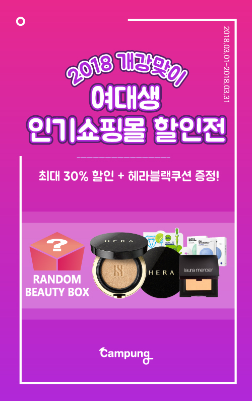 이번 아이캠펑과 함께하는 ‘2018 여대생 인기 쇼핑몰 할인전’은 아이캠펑 어플리케이션에서 3월 1일부터 3월 31일까지 쇼핑몰 별 한정수량 판매로 진행된다.