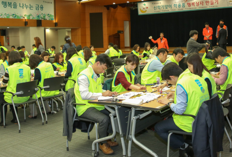 이 날 봉사활동에 참여한 하나금융그룹 임직원들은 필통과 에코백을 손수 제작해 다양한 학용품, 간식 등과 함께 ‘행복상자’에 정성껏 담았다.