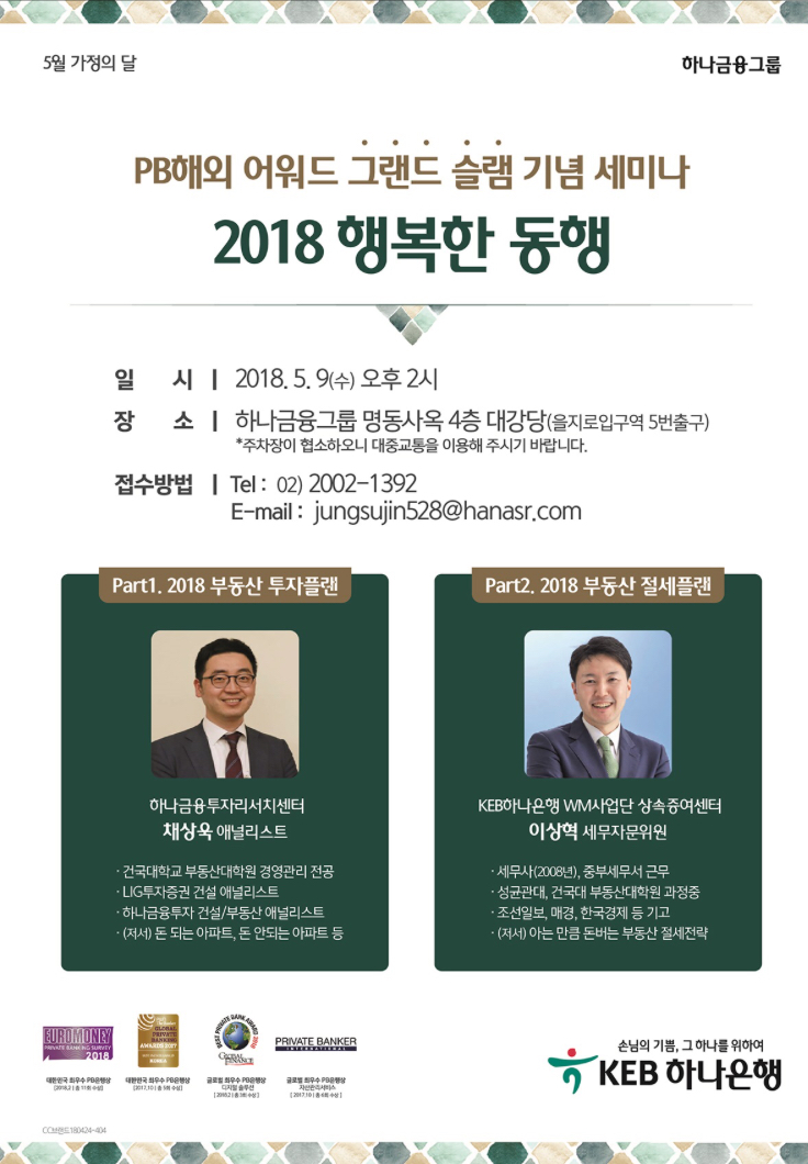 ‘행복한 동행 세미나’는 지난해 11월에 처음 열렸다. 작년 프라이빗 뱅킹 (Private Banking)관련 4 대 해외 어워드인 유로머니 , 글로벌파이낸스 , PB 인터내셔널 , 더뱅커 誌 에서 모두 수상한 ‘ 그랜드슬램 ’ 달성으로 검증된 PB 서비스를 가정의 달에 손님들에게 감사의 마음으로 제공해 드리려는 취지로 마련됐다.