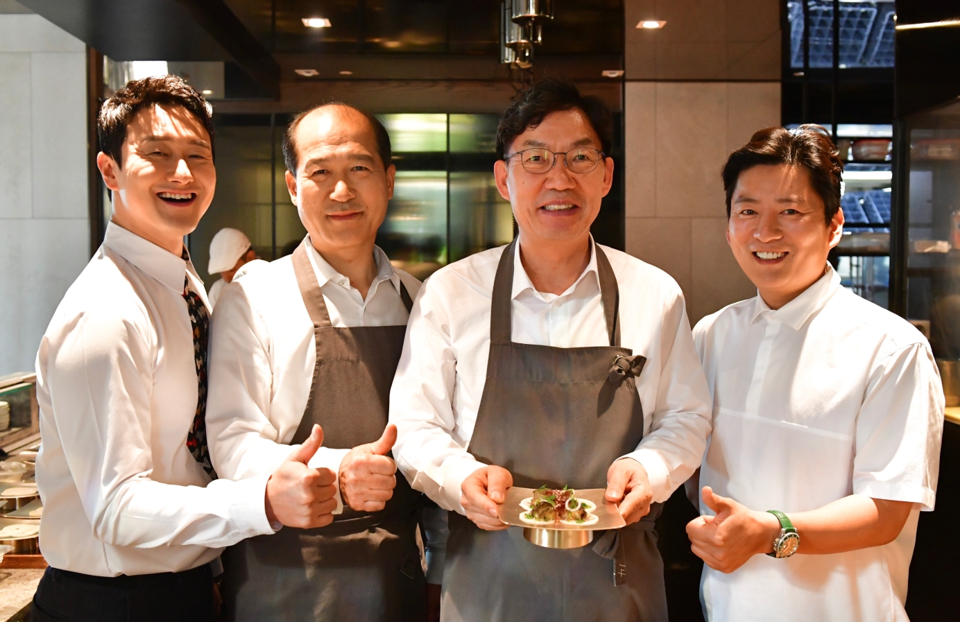 [소비자경제=임선영 기자] 이대훈 농협은행장이 강레오 셰프와 함께 고객과농업인을 초청해 특별한 요리 선물을 선보였다.