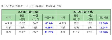 부동산 정보업체 부동상써브는 "이 같은 현상은 지방(09년 6.75%→10년 12.24%)이 다소 살아났음에도 불구하고, 수도권지역(09년 60.6%→10년 23.88%) 청약이 크게 저조해 나타난 현상이다"로 풀이했다.