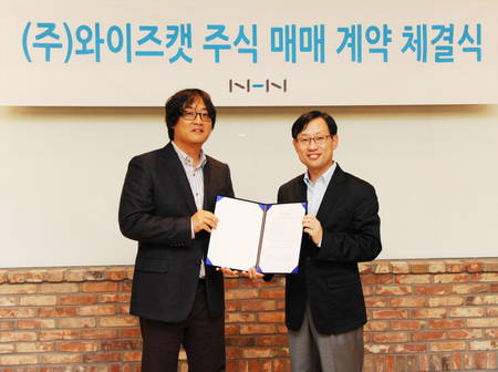회사 측에 따르면 5일, 분당 NHN 그린팩토리 사옥에서 와이즈캣 주식매매계약 체결식을 갖고, 이와 같은 내용의 계약서에 서명했다.