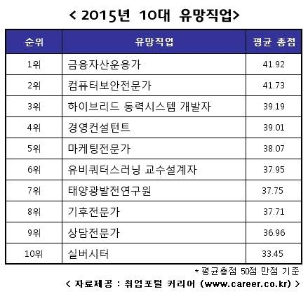 취업포털 커리어(www.career.co.kr)는 지난 9월 29일부터 10월 4일까지 커리어 컨설턴트 42명을 대상으로 서면조사를 실시, 그 결과를 바탕으로 ‘2015년 10대 유망직업’을 선정했다.