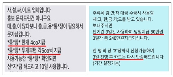 "통장 1개 400만원, 2개부터는 각 500만원을 선지급 한다"거나 “3일만 사용 후 카드를 다시 반송하고 매일 사용료를 지급 하는 조건”을 제시하는 등, 고액의 현금을 즉지 지불한다고 강조하는 경우다.