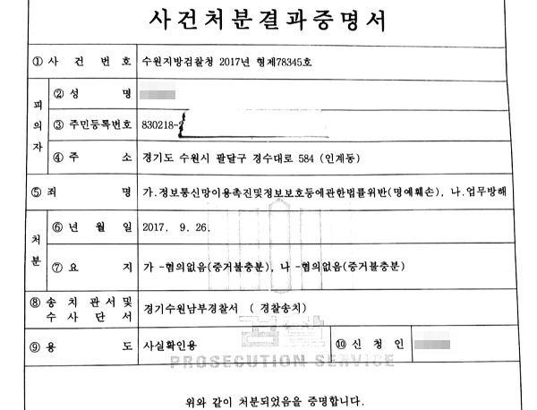 업체가 고소를 취하했다고 하지만 김 씨가 전해 준 수원지검 사건처분결과증명서(아래 사진)에는 ‘혐의 없음’으로 처리해 소송까지 진행되지도 않았다.