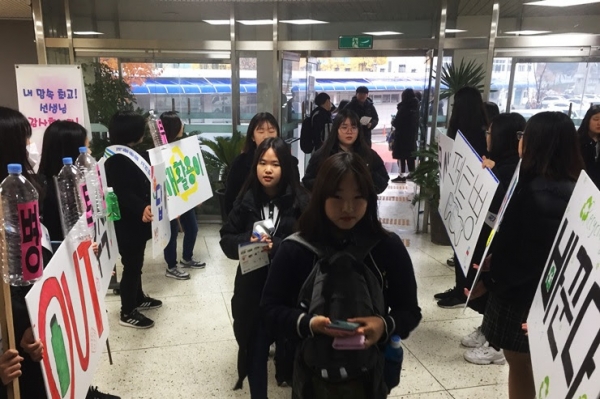 [소비자경제=장병훈 기자] 의정부녹색소비자연대는 7일 오전 경민여자중학교에서 본교 1학년 20여명이 참여한 가운데 재학생 335명을 대상으로 페트병 자원 재활용률을 높이기 위한 '무색 더 나은 재활용 캠페인'을 진행했다.