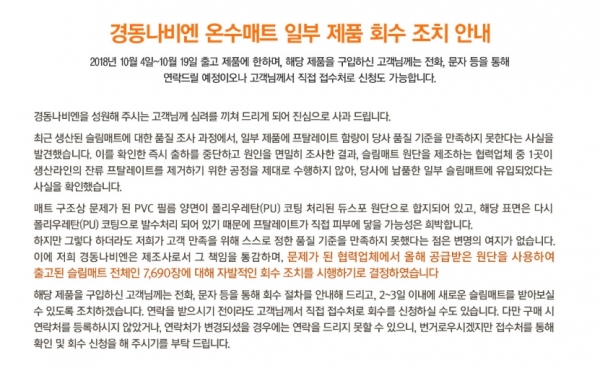 경동나비엔은 지난 3일 자사 온수매트 제품 일부의 원단이 법적 기준치를 넘긴 ‘프탈레이트’를 함유하고 있다며 자발적 회수 조치하겠다고 밝히고 4일부터 회수에 들어갔다. 회수 대상 제품은 지난 10월 4일부터 19일 사이에 출고된 슬림형 매트로 총 7690장에 달한다.