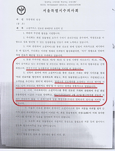 하지만 담당 주무관은 "서울시수의사회가 마이펫플러스 홈페이지 방문을 통해 결재하는 경우 기존보다 50% 할인해준다는 문구가 있었다고 주장해 유인행위에 해당할 수도 있다고 봤으나, 현재는 이에 대한 오해가 풀린 것으로 보인다"고 설명했다.