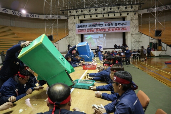 노조 관계자는 “이번 찬반투표는 잠정합의안을 부결시켜 재교섭을 통한 대우조선 인수반대 파업투쟁을 이어가자는 의견과 임단협을 마무리하고 2019년 투쟁에서 인수반대투쟁을 이어가자는 현장 여론이 있었는데 조합원들은 후자를 선택했다”고 설명했다.