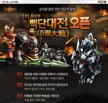 <적벽>의 ‘백단대전(百團大戰)’ 업데이트와 이벤트에 대한 자세한 내용은 올스타 웹사이트(www.allstar.co.kr)에서 확인할 수 있다.