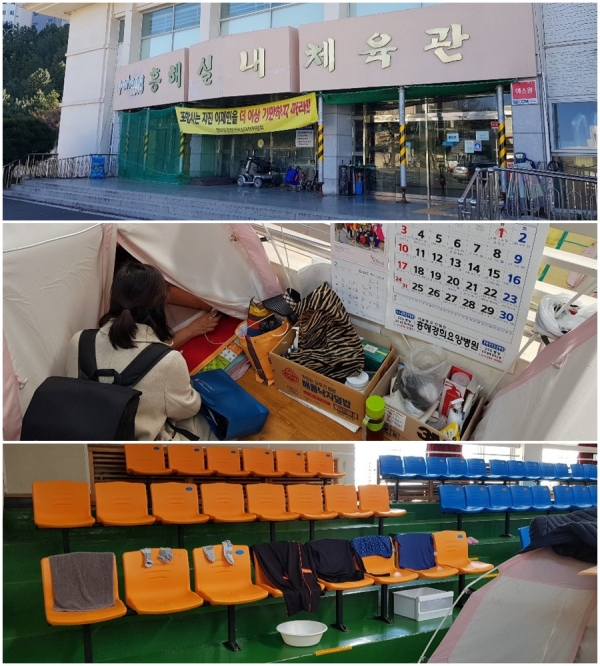 흥해체육관은 2017년 지진 이후 설치된 텐트를 여전히 치우지 못한 모습 그대로였다. 달라진 것이 있다면 빈 텐트가 많아졌다는 것. 시에서 제공하는 밥차로 끼니는 해결하지만 두 해를 넘기도록 좁은 텐트안에서 불안정한 생활을 이어오면서 육체적, 정신적 고통을 이루 말할 수가 없었다는 것이 이재민들의 하소연이다.