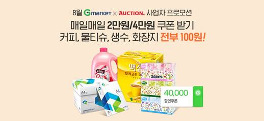 G마켓과 옥션은 8월 한 달간 사업자 회원의 부담을 줄여주는 프로모션을 진행한다. 추석 시즌을 맞아 선물 또는 대량 구매 시 유용하게 사용할 수 있는 2만원, 4만원의 고액 할인 쿠폰을 매일 제공하며, 신규회원 및 웰컴회원 대상으로 일부 품목에 대해 ‘100원딜’을 진행한다. 사업자회원이라면 누구나 특정 제품 브랜드 상품을 반값에 구매할 수 있는 ‘사업자 반값’ 코너도 운영한다. 이외에도 특정 제품 박스 구매 시 2~3천원 중복 할인 쿠폰으로 더욱 저렴하게 구매할 수 있다.