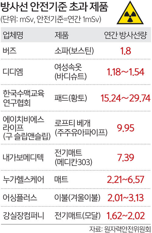 에이치비에스라이프(구 슬립앤슬립)가 2013년부터 2017년까지 판매한 로프티 베개 1종(주주유아파이프·2천209개)은 연간 9.95mSv, 내가보메디텍이 2014년부터 2018년까지 판매한 전기매트 1종(메디칸303·30개)은 연간 7.39mSv인 것으로 조사됐다.